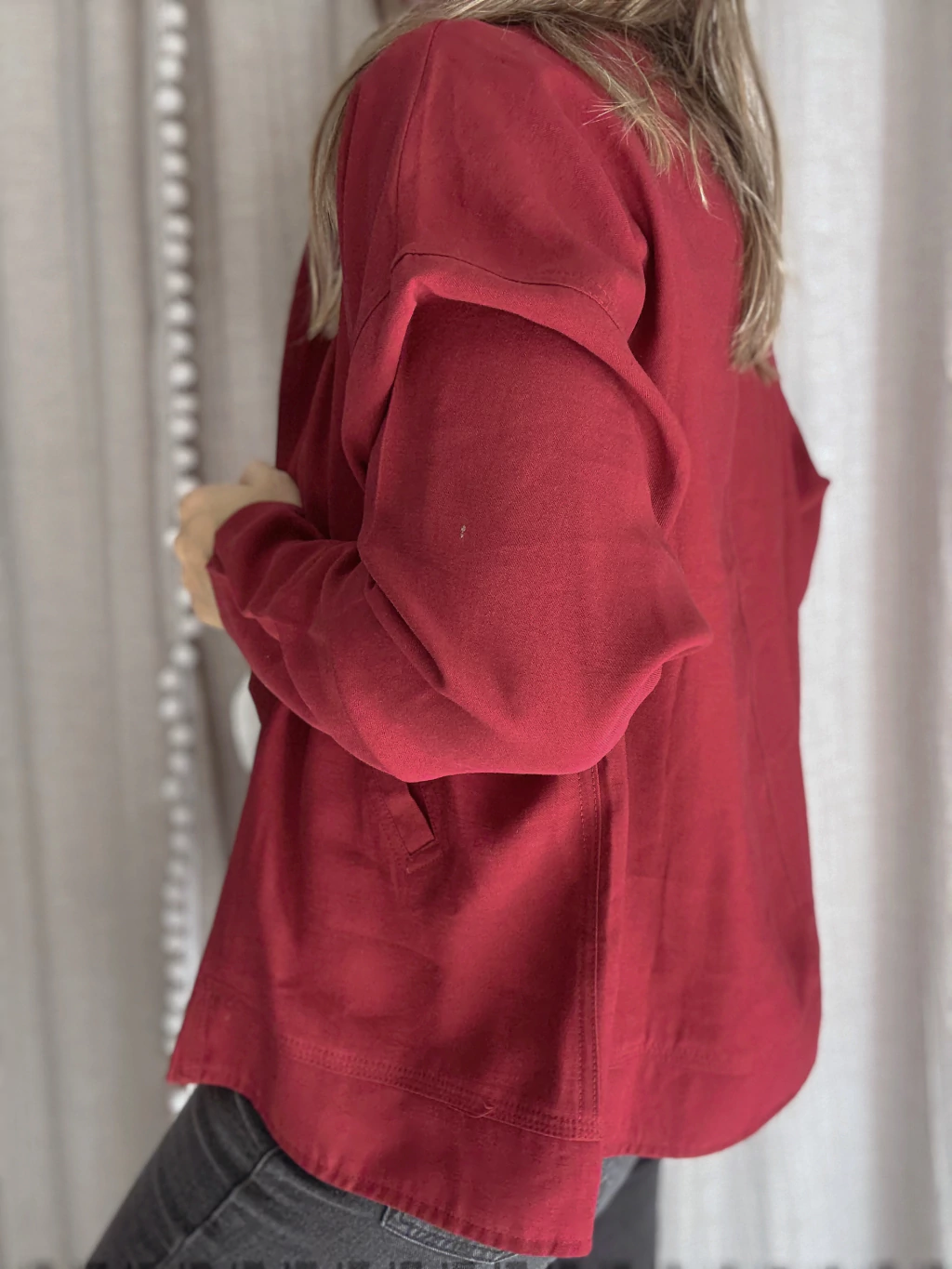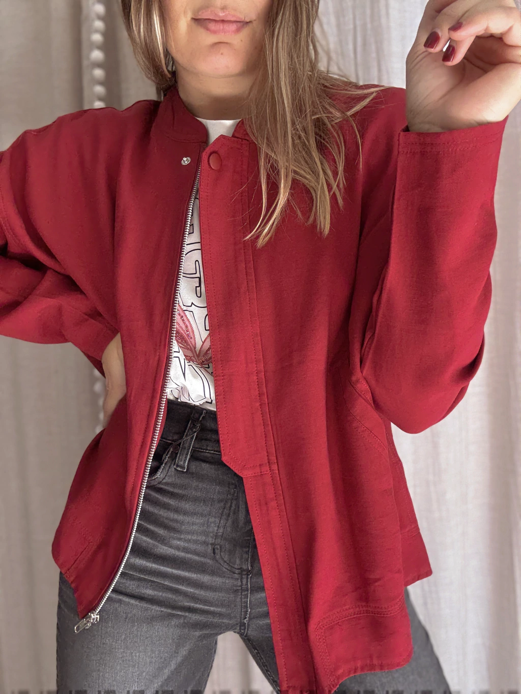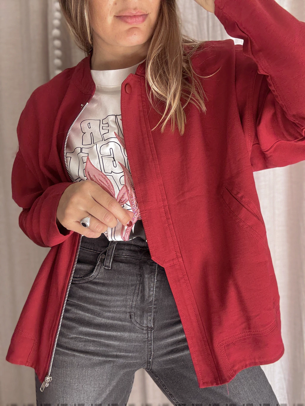 La bomber SAMBLA combina un diseño urbano con un toque sofisticado. Confeccionada en un tono bordo intenso, presenta un calce relajado y moderno que la convierte en una prenda versátil y protagonista. Cuenta con cierre metálico en la parte frontal, bolsillos laterales y terminaciones prolijas que realzan su estructura.